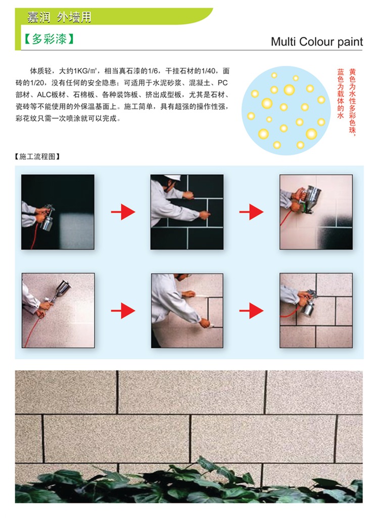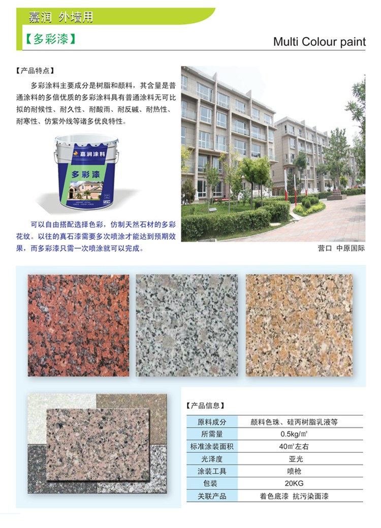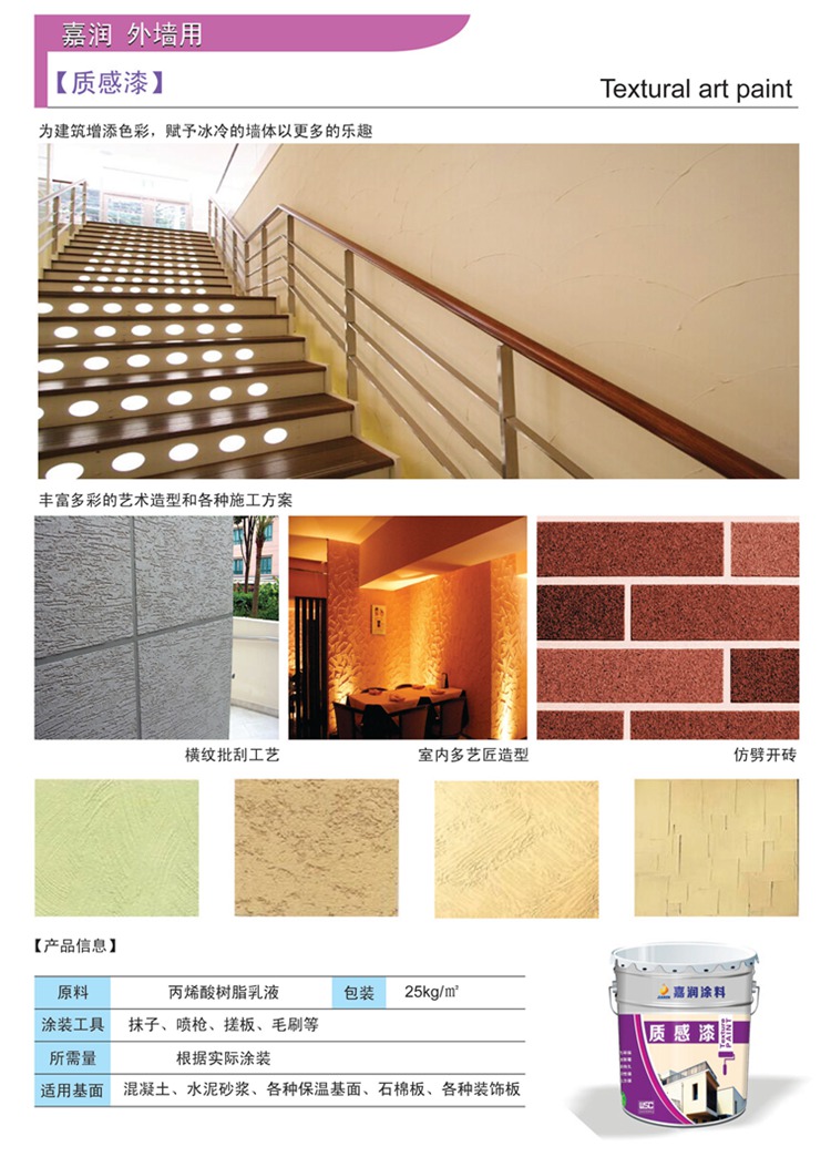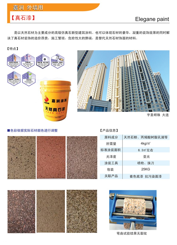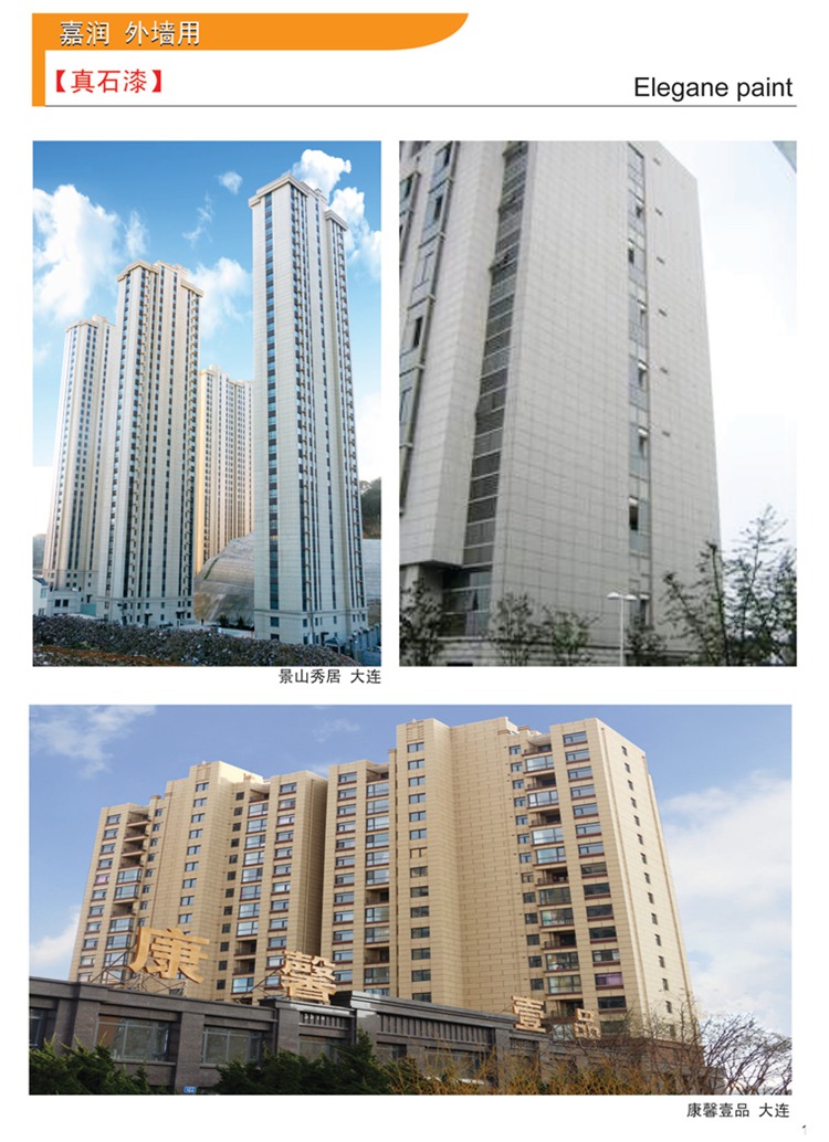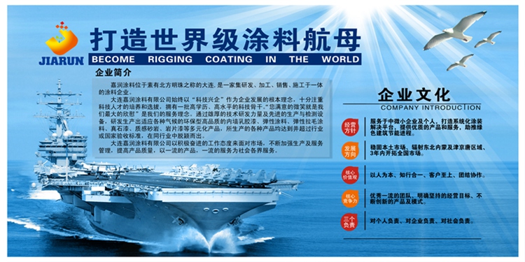 •    嘉润涂料位于素有北方明珠之称的大连,是一家集研发、加工、销售、施工于一体的涂料企业。    大连嘉润涂料有限公司始终以“科技兴企”作为企业发展的根本理念,十分注重科技人才的培养和选拔,拥有一批高学历、高水平的科技骨干。您满意的微笑就是我们最大的欣慰是我们的服务理念。通过雄厚的技术研发力量及先进的生产与检测设备,研发生产出适应各种气候的环保型高品质的内墙乳胶漆、弹性涂料、真石漆、质感砂岩、岩片漆等多元化产品,所生产的各种产品均达到并超过行业或国家验收标准,在同行业中脱颖而出。    大连嘉润涂料有限公司以积极奋进的工作态度来面对市场,不断加强生产及服务管理,提高产品质量,以一流的产品,一流的服务为社会各界服务。