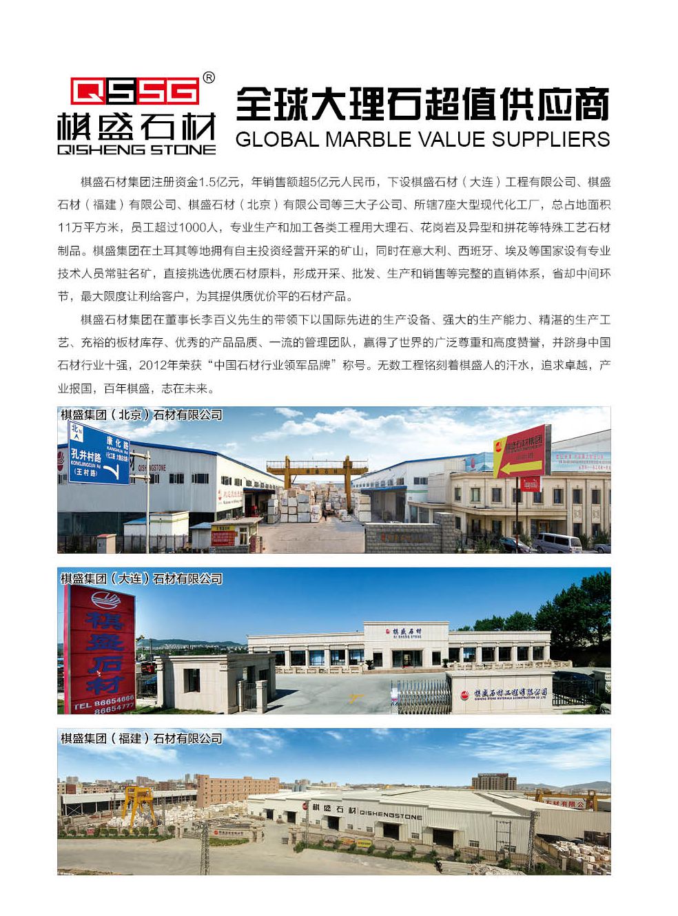 棋盛石材集团注册资金1.5亿元,年销售额超5亿元人民币,下设棋盛石材(大连)工程有限公司、棋盛石材(福建)有限公司、棋盛石材(北京)有限公司等三大子公司、所辖7座大型现代化工厂,总占地面积11万平方米,员工超过1000人,专业生产和加工各类工程用大理石、花岗岩及异型和拼花等特殊工艺石材制品。棋盛集团在土耳其等地拥有自主投资经营开采的矿山,同时在意大利、西班牙、埃及等国家设有专业技术人员常驻名矿,直接挑选优质石材原料,形成开采、批发、生产和销售等完整的直销体系,省却中间环节,最大限度让利给客户,为其提供质优价平的石材产品。