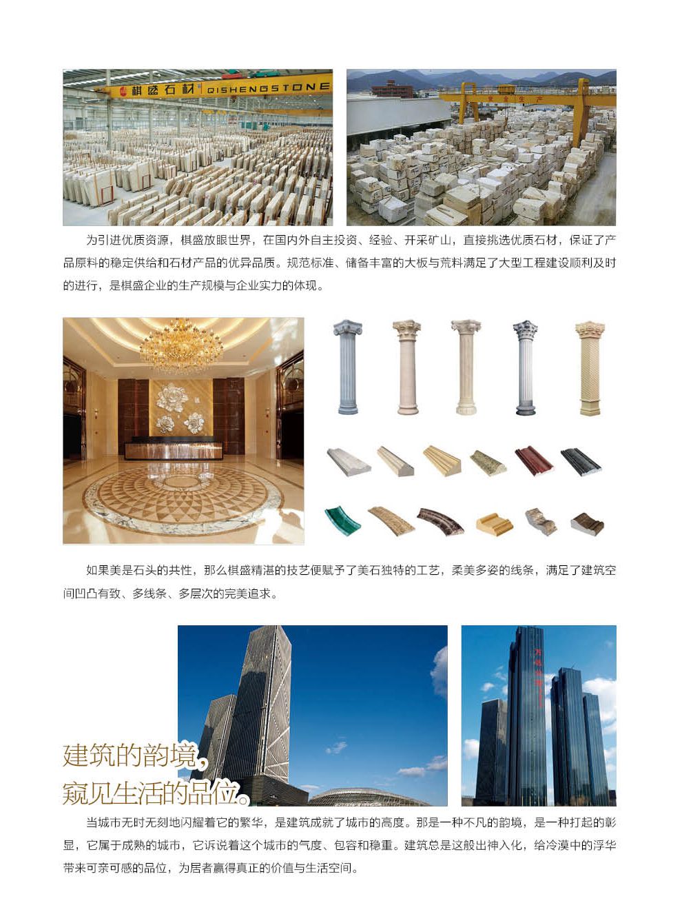 棋盛石材集团在董事长李百义先生的带领下以国际先进的生产设备、强大的生产能力、精湛的生产工艺、充裕的板材库存、优秀的产品品质、一流的管理团队,赢得了世界的广泛尊重和高度赞誉,并跻身中国石材行业十强,2012年荣获“中国石材行业领军品牌”称号。无数工程铭刻着棋盛人的汗水,追求卓越,产业报国,百年棋盛,志在未来。